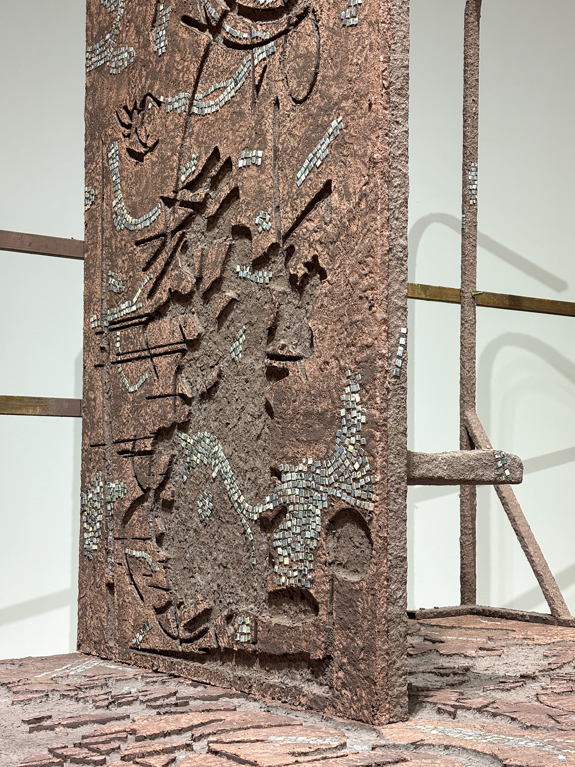 Fragments of image tiles are also embedded in the surface. These are sourced from the artist’s immediate surroundings, scraped as though peeling away the skin of place, leaving their original contexts obscured. The images were transferred onto wooden panels, cut into small pieces, and irregularly inlaid into the pulp surface before it dried. Through this process, any coherent form disappears, leaving only indecipherable fragments. Yet, these dispersed shards coalesce again, evoking the contours of a map or suggesting unseen pathways.